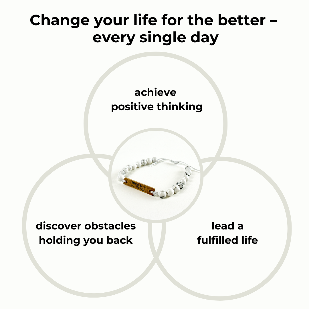 It comes to your door as a monthly subscription box. Each month brings a new mantra bracelet that focuses on one of the most important lessons for a happy fulfilled life. Each box includes the proven practices and more to help you embody that month's mantra, as well as a bracelet to help you remember the mantra all day long.